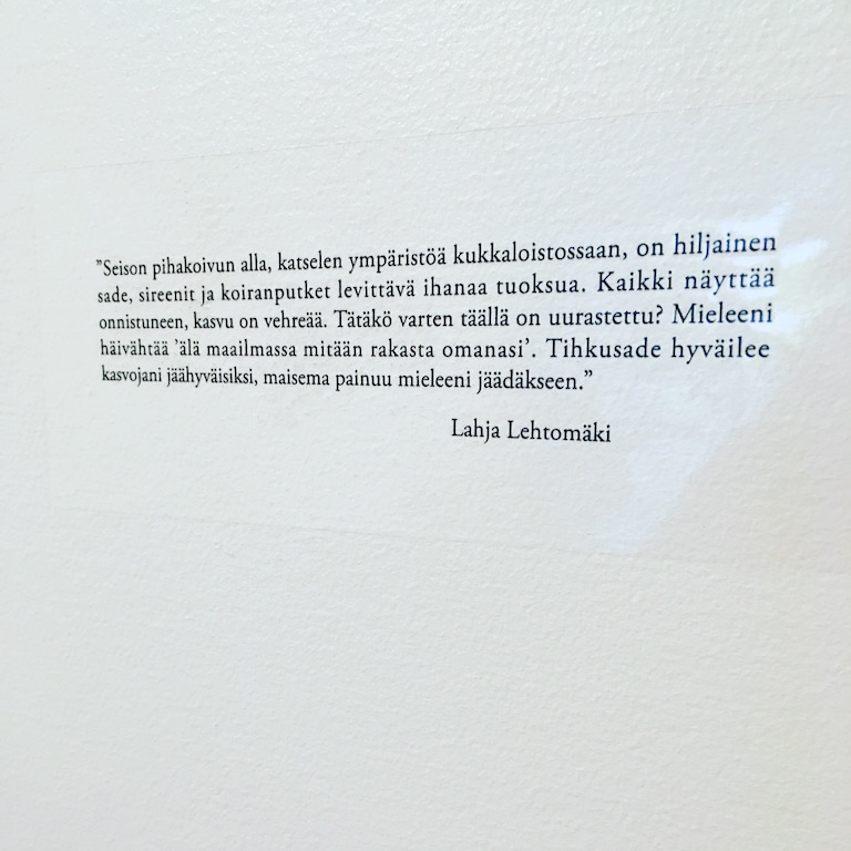 Moisseisen lyijykynätekniikalla toteutetusta Kannas-sarjakuvakirjasta olivat esillä alkuperäiset vedokset, hauskasti pyykkinarulle ripustettuina. Katsoin metritolkulla jatkuvaa paperiseinää ja mietin, että jaksankohan keskittyä lukemaan nämä kaikki läpi. Puolivälissä oli pakko rapistella laukusta ensimmäinen nenäliina kouraan, kun huomasin vollottavani sarjakuvalle. Edellisen kerran näin kävi Maus-sarjakuvan kanssa.