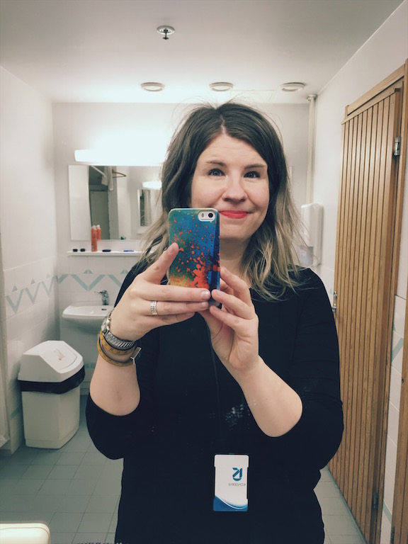 Yllä oleva kuva on otettu viikko sitten lauantaina, kesken työpäivän, lehtitalon naistenvessassa. Olin juuri tullut tosi kivalta kuvauskeikalta ja lähdössä toiselle vielä kivemmalle. Halusin tallentaa hetken, jolloin olin sekä viikonlopputöissä että täydellisen onnellinen: monen mielestä kertakaikkisen mahdoton yhtälö.