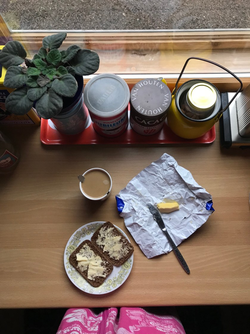 Keitän kupillisen vahvaa kahvia, levitän sitkeälle ruisleipäpalalle paksusti voita.